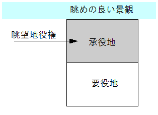 下の図は、良好な眺望を確保するために、自分の敷地=要役地のまえの敷地に、高い建物などを建てないような地役権を設定・登記した例である。